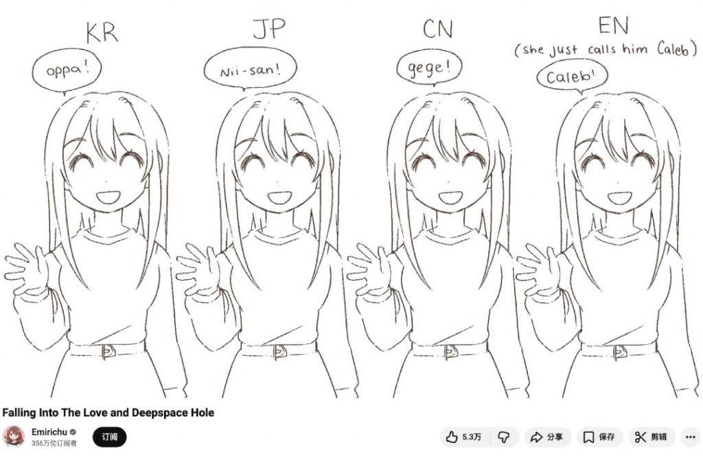 英语版本《恋与深空》玩家、YouTube博主@Emirichu总结了同一个角色在不同语言游戏版本中的称呼变化
